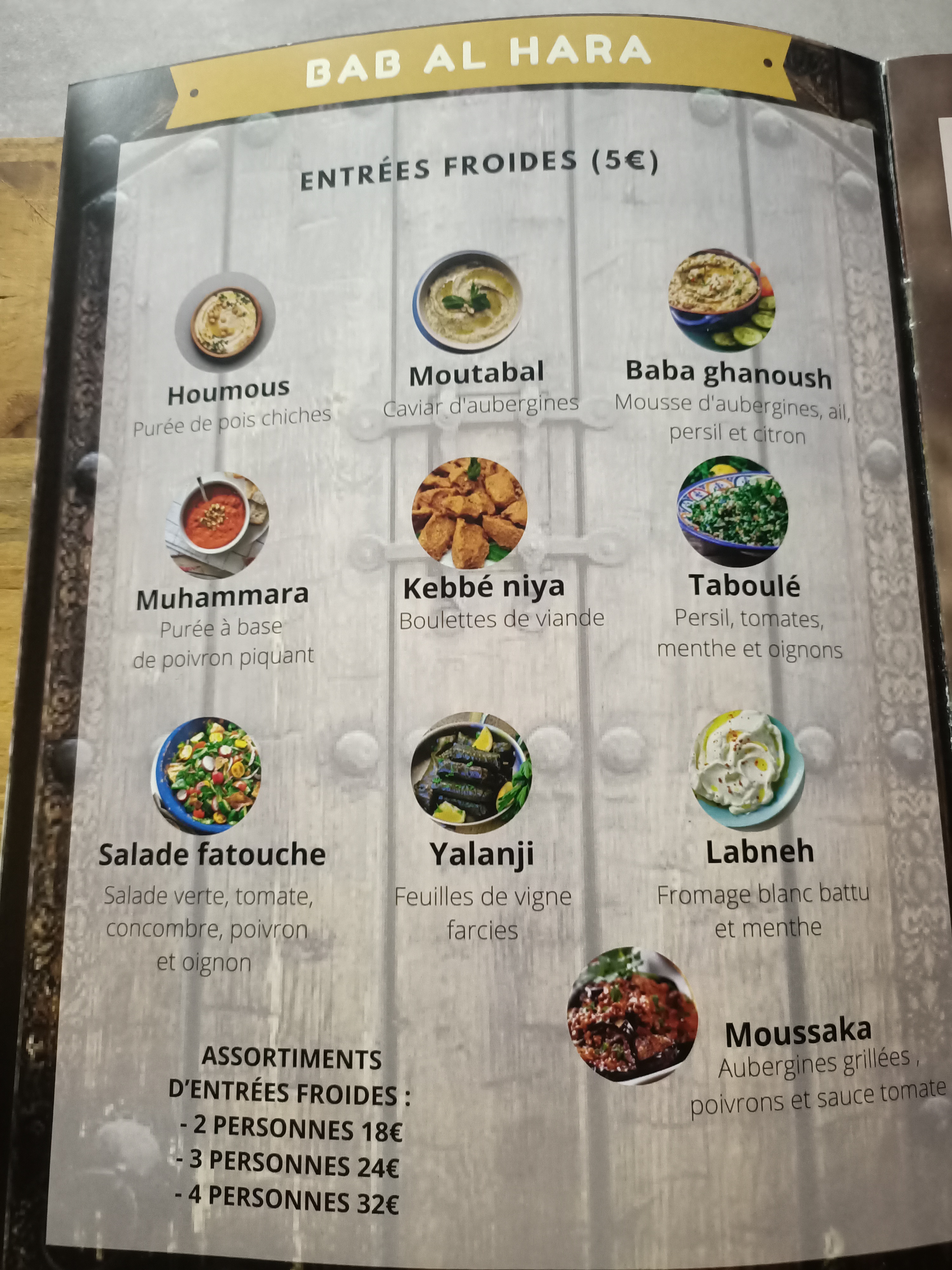 Le menu 30e a la caisse 45e Hoummos qui vient tout droit de la boîte de conserve tout sec le pain froid au minimum il aurait du le réchauffer au micro-ondes !!! grillades froide prépare 4h a l'avance servi dans le tas dégueulasse il cache tout ça derrière les épices fort sinon l'ambiance pas mal les chanteurs pas mal du tout mais c vraiment dommage pour les menus