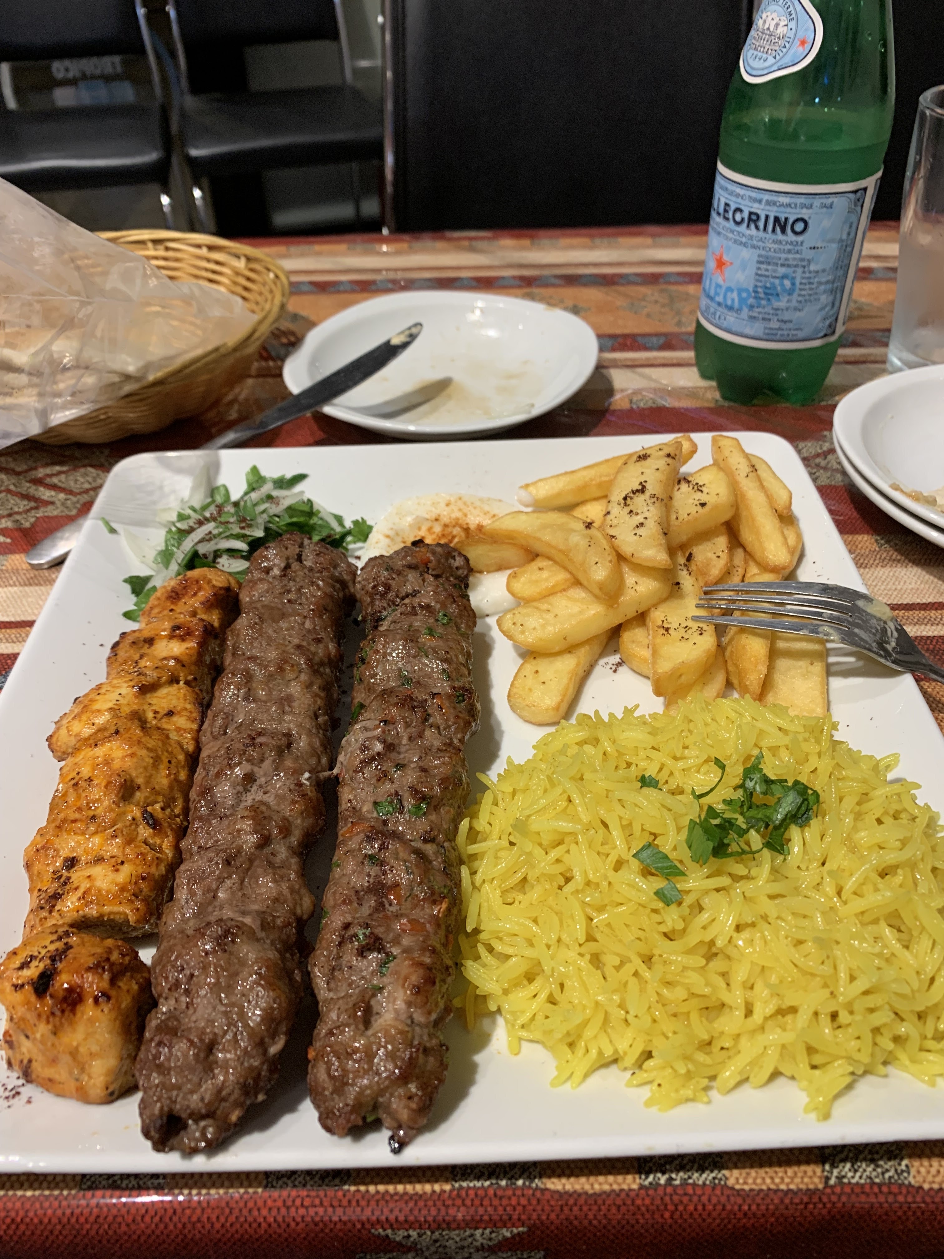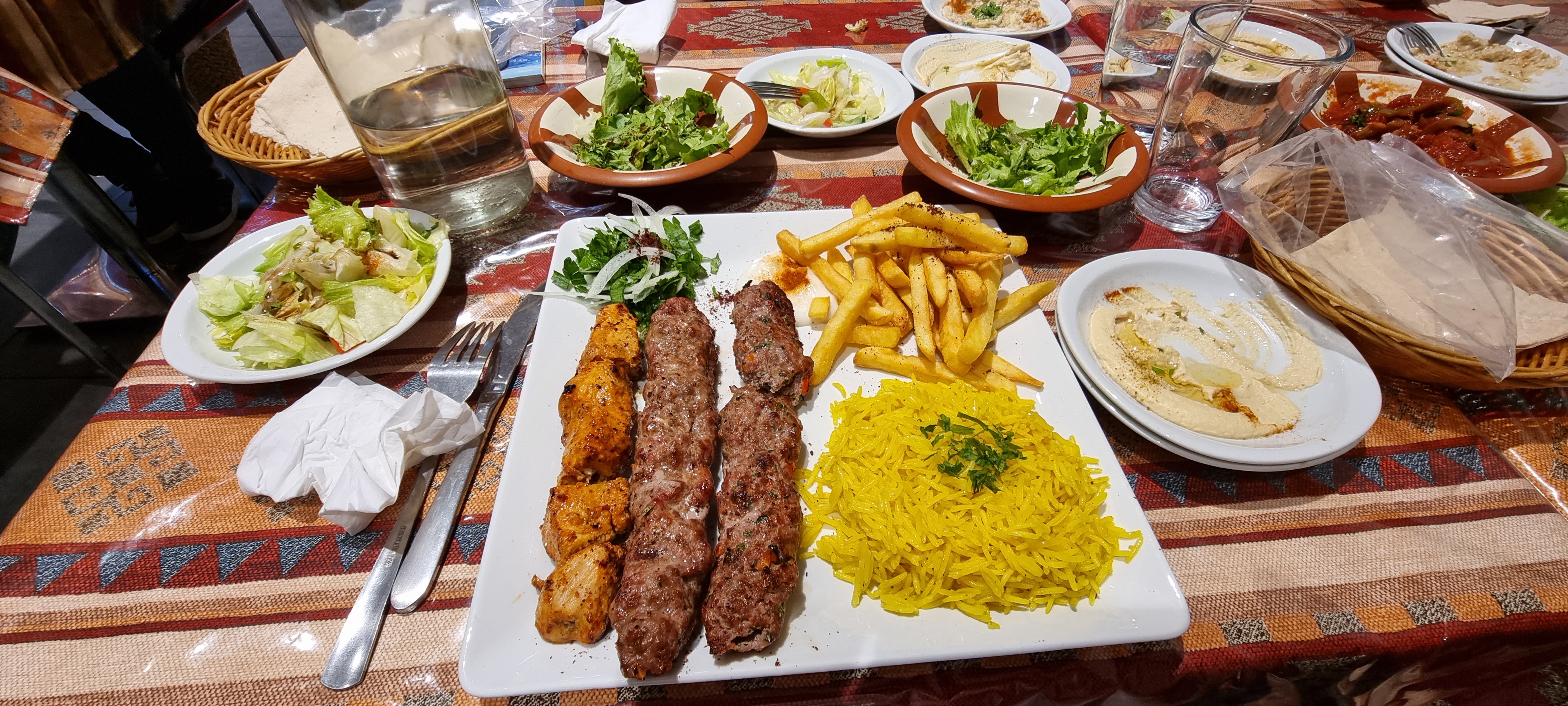 Restaurant choisi en fonction des notes google. Et excellent choix ! Des mezzes très savoureux et frais. Caviar d’aubergine, hummus délicieux, onctueux… avec un bon pain. Ensuite, brochette de viande mixée. Une aux 7 épices. Une épice et menthe. Cuisson au barbecue parfaite. La viande demeure tendre avec un goût de grillade. Le tout accompagné d’un riz parfait. Je recommande vivement surtout pour le rapport qualité prix de 16,50 euros. Service sympathique. Je reviendrai :) !