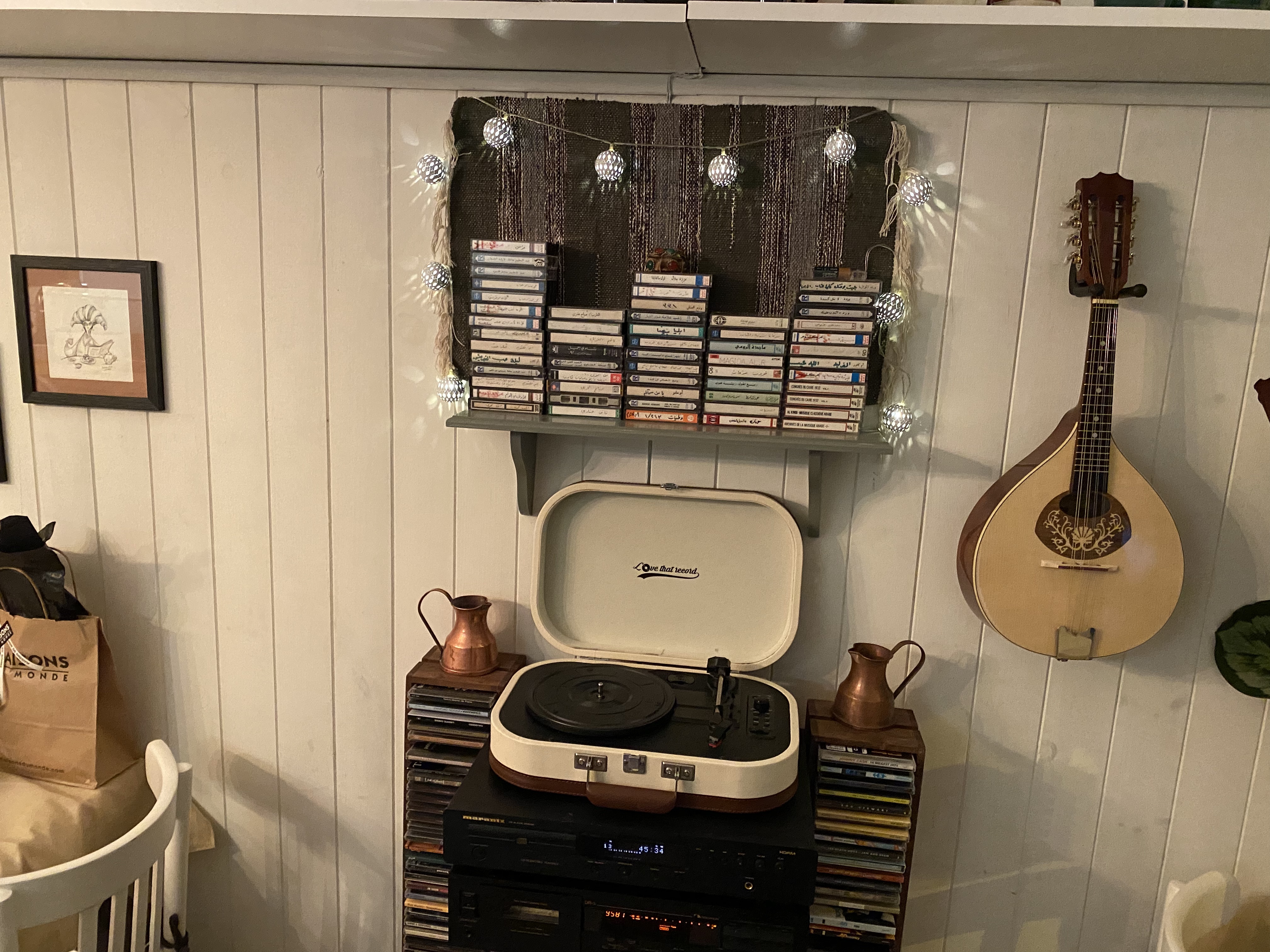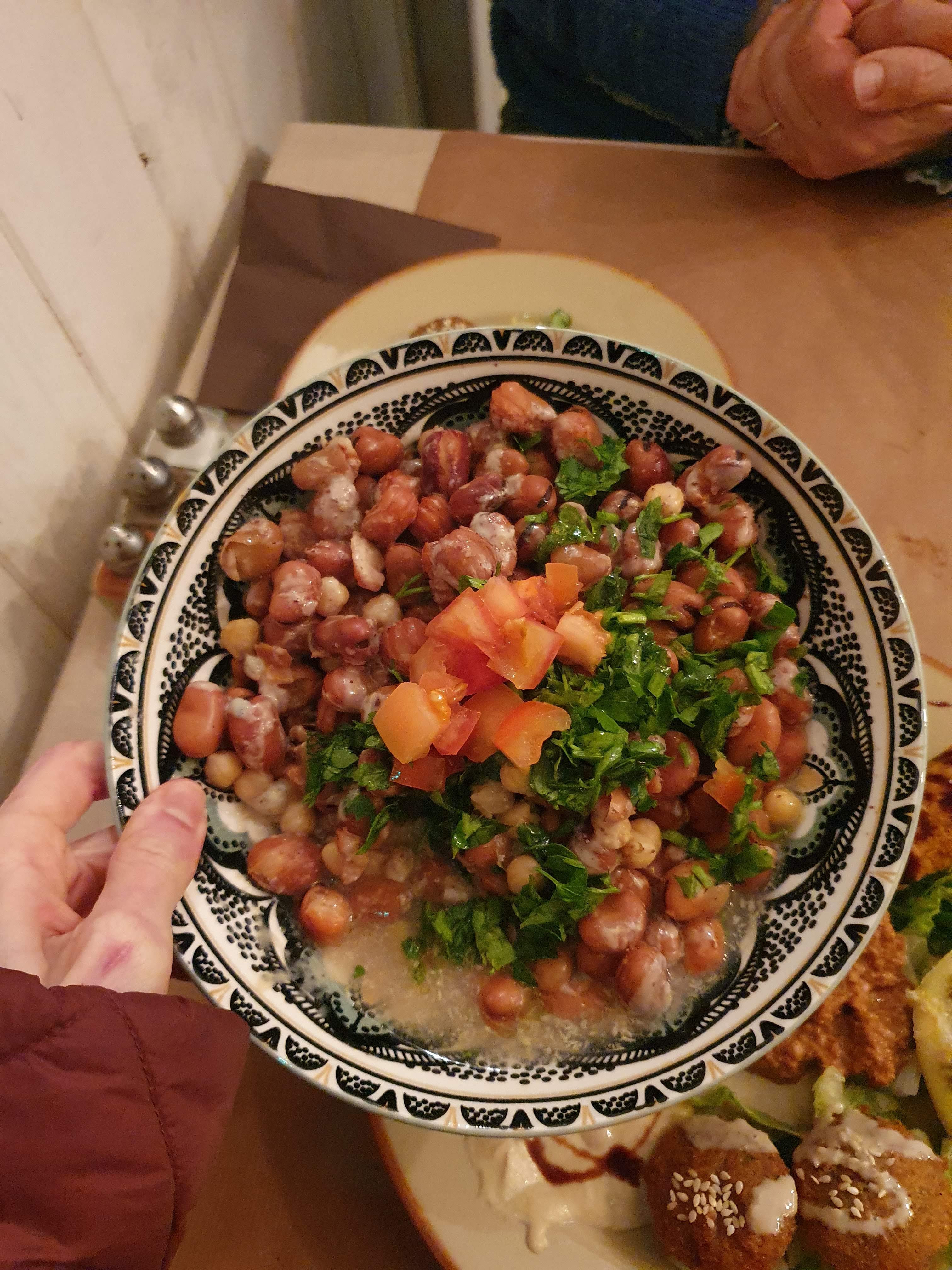 Atmosphère; C'est un endroit où vous vous sentirez les bienvenus, vous flânerez dans le salon de Maen et de sa famille, la chambre aimante d'une famille d'artistes, entourés de musique, d'art, de souvenirs qu'ils ont collectés tout au long du années. Nourriture; Une bonne sélection de délicieux plats syriens, préparés de la même manière que Maen le préparait à ses amis occidentaux venant manger un morceau chez lui, avec de petits ajustements pour être gentil avec les palais européens. J'ai beaucoup apprécié le Fattet Makdous, j'ai demandé qu'il soit fabriqué de manière traditionnelle ; pas de considérations de palais sensibles ;). Un vinyle jouait en arrière-plan et je pouvais observer Maen dans la cuisine préparer les plats tout en fredonnant la musique.