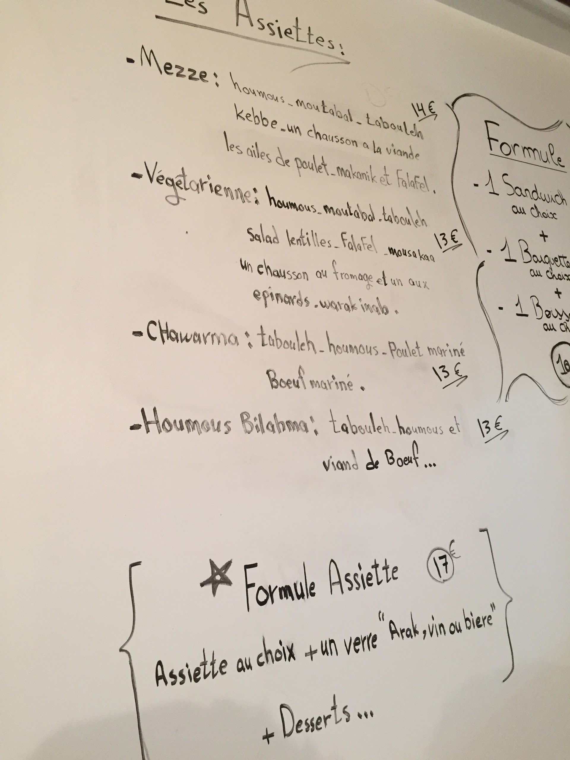 Sandwich à 8,50 est très bon (j’ai goûté celui à la saucisse syrienne) mais pourrait être plus grand pour le prix. Je recommande quand même si vous n’avez pas grand appétit, sinon si votre porte monnaie est plus rempli le menu à 14€50 a l’air bien fourni !
