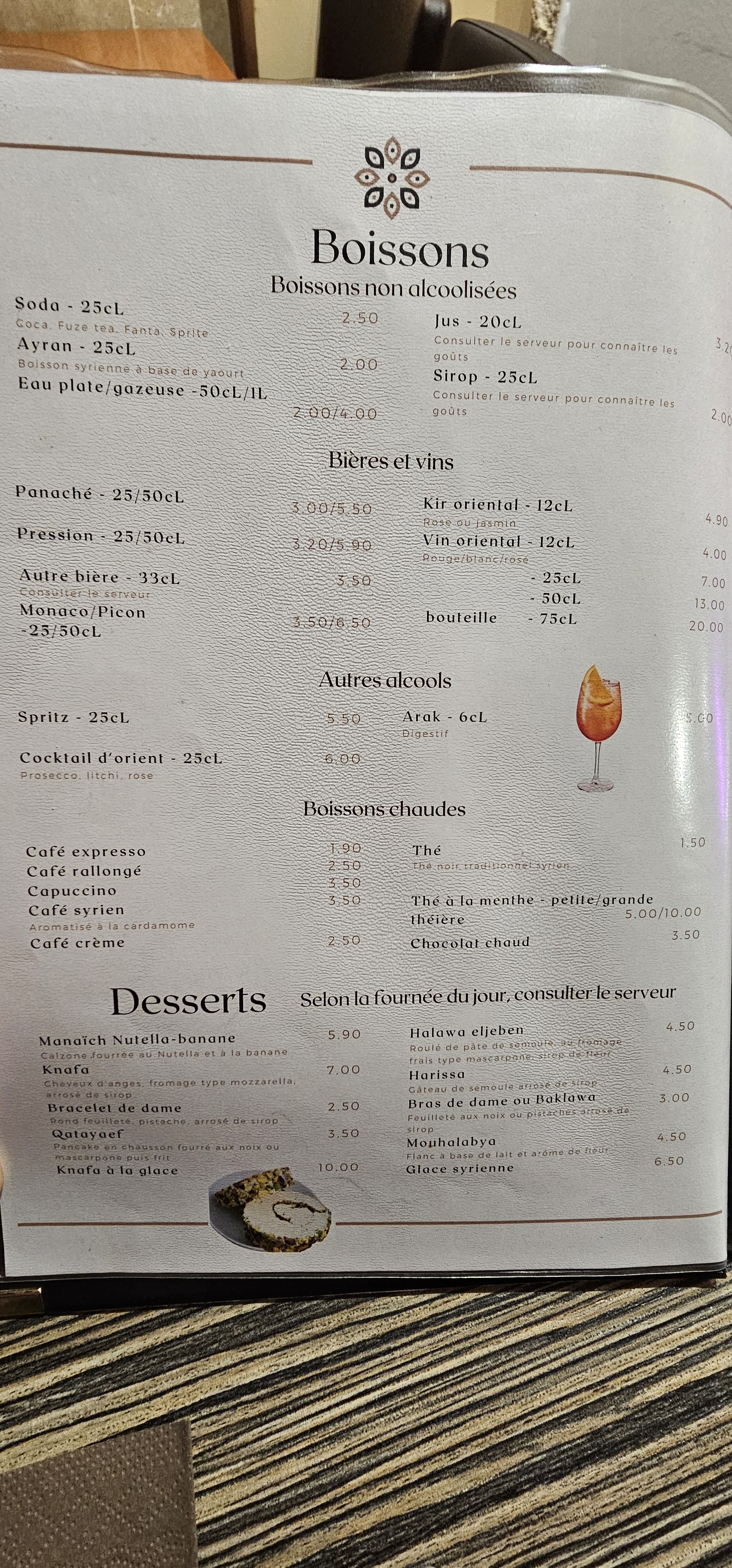 Une super expérience : déco magnifique, plats savoureux, un serveur très aimable et tout ça à petit prix...allez-y sans hésiter si vous voulez manger syrien.