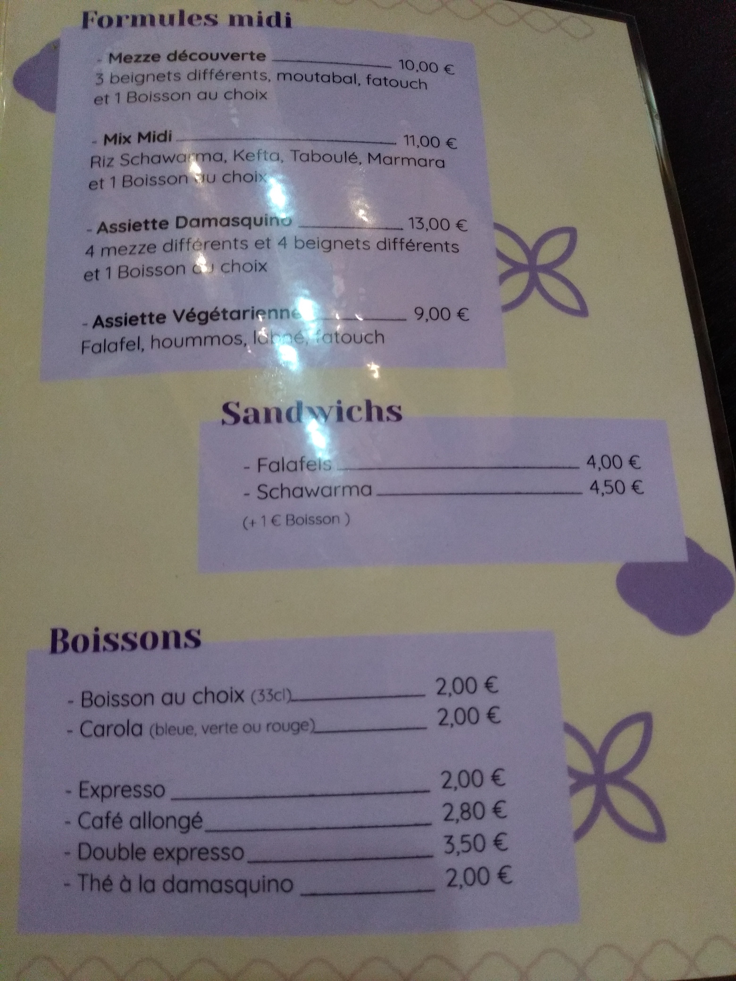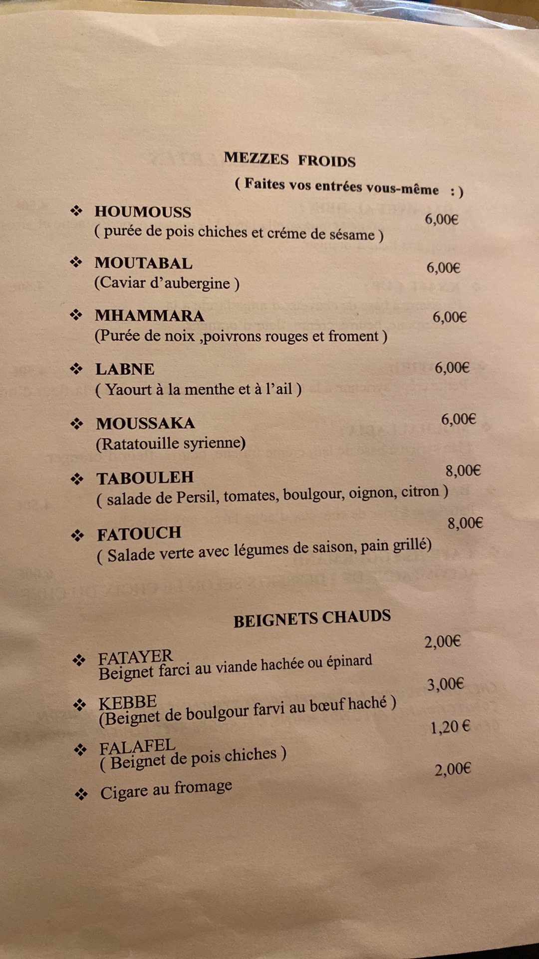 1ère expérience de restauration syrienne et 100% conquise c'était un vrai régal de plus prix très raisonnables je recommande vivement !!
