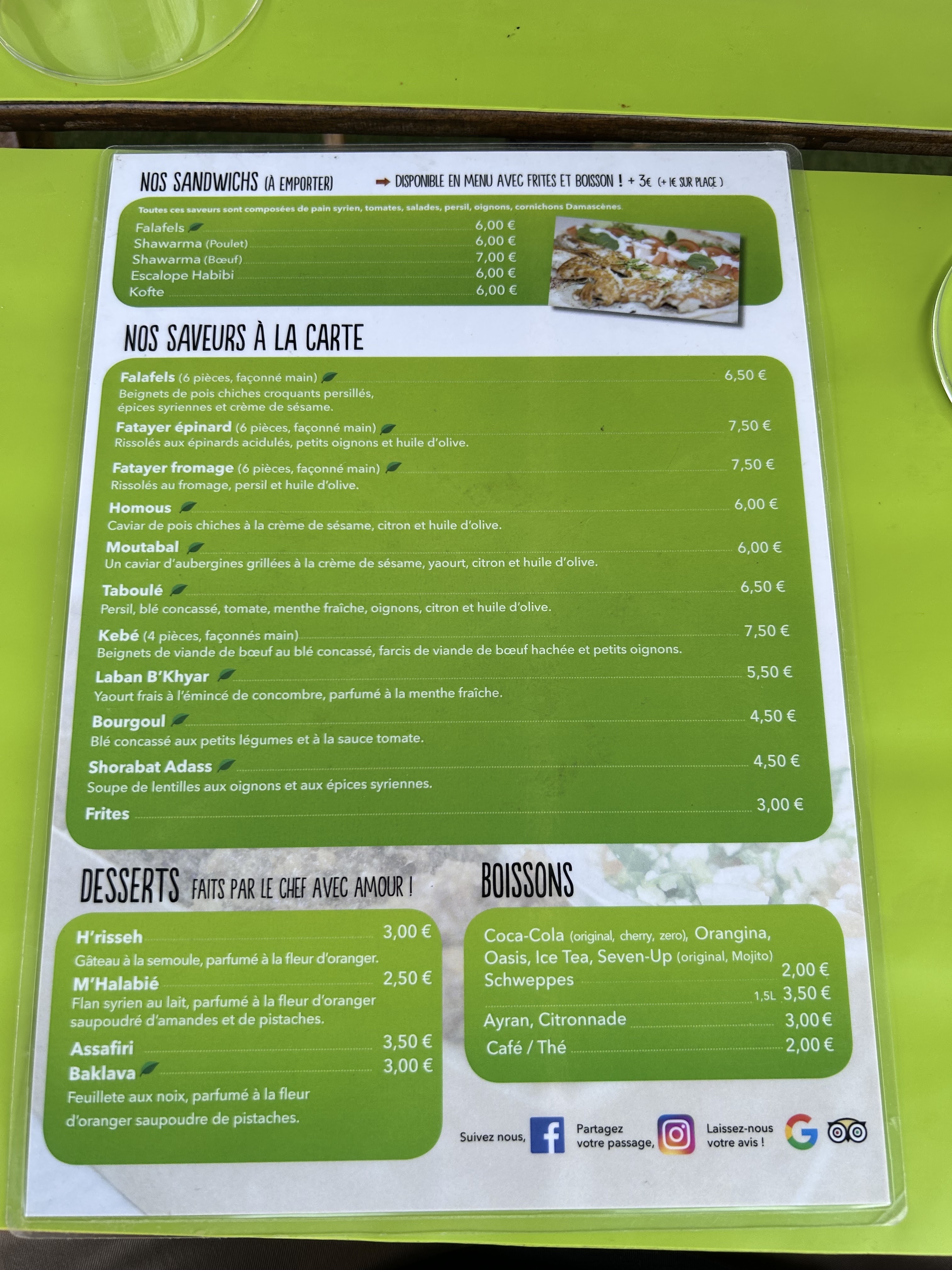 Nous nous sommes régalés avec leurs excellents falafels. Table à recommander les produits sont frais ! Je recommande particulièrement le taboulé et leur rafraîchissante citronnade maison ! Les serveurs sont accueillants et très professionnels.