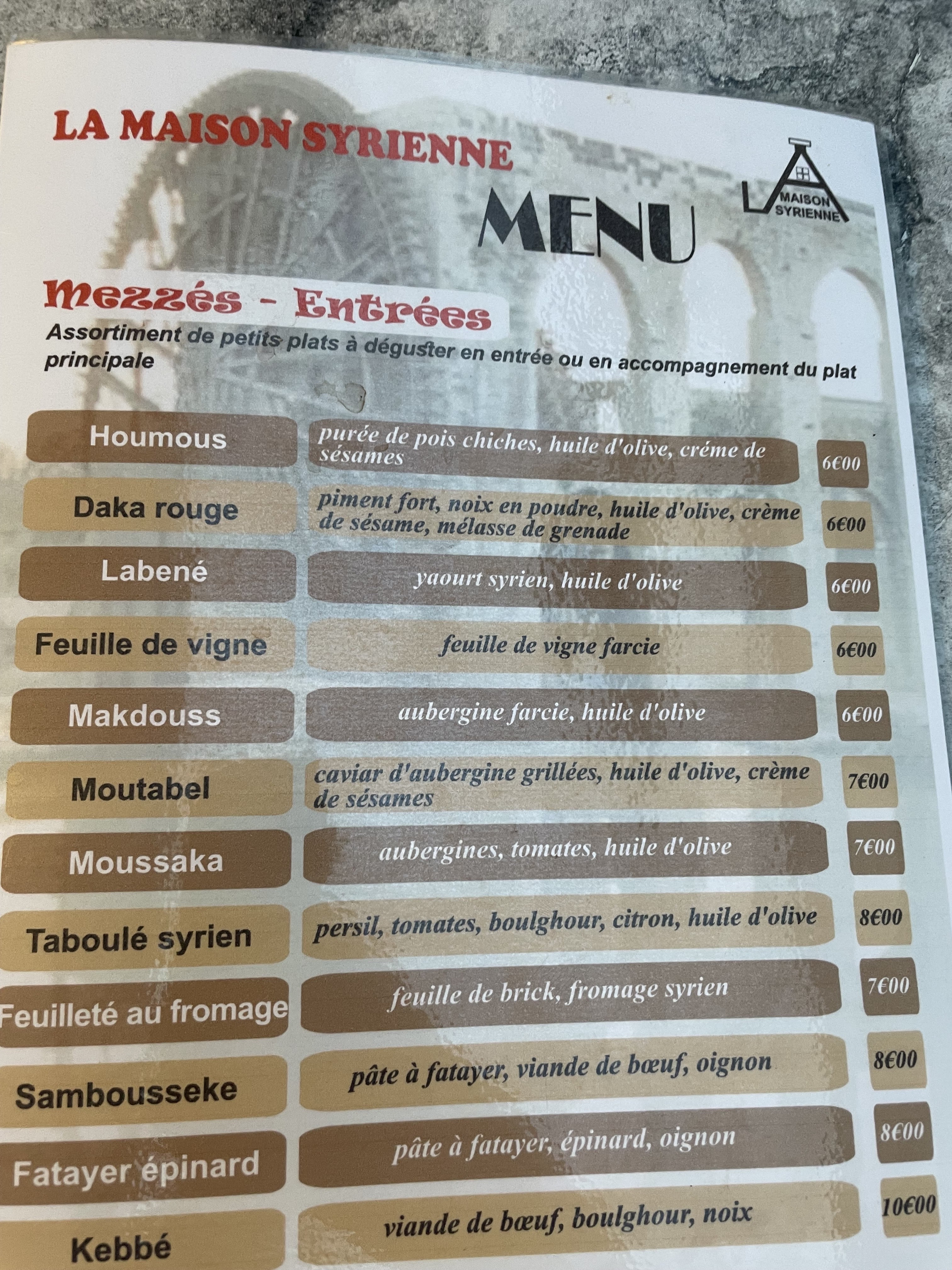 Un endroit convivial, où l'on mange très bien et en grande quantité, je ne pensais pas me régaler autant ! La cuisine syrienne est fantastique, je ne peux que vous conseiller de prendre un mezze avec quelques amis pour vraiment passer un bon moment (sur la photo un mezze pour 4 personnes) Foncez y si vous ne savez pas où aller manger un soir où la ville est agitée, car La Maison Syrienne est injustement trop peu fréquentée !