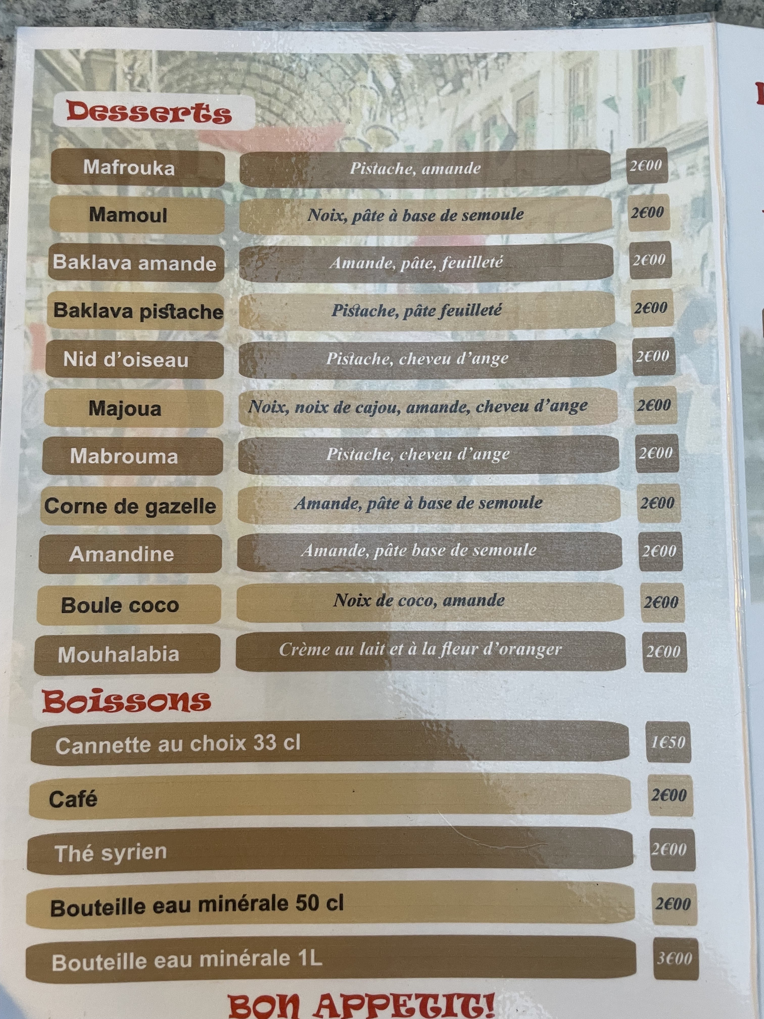 bon restaurant syrien je me suis régalé et les desserts étaient particulièrement bon, surtout ceux à la pistache que je recommande completement!!