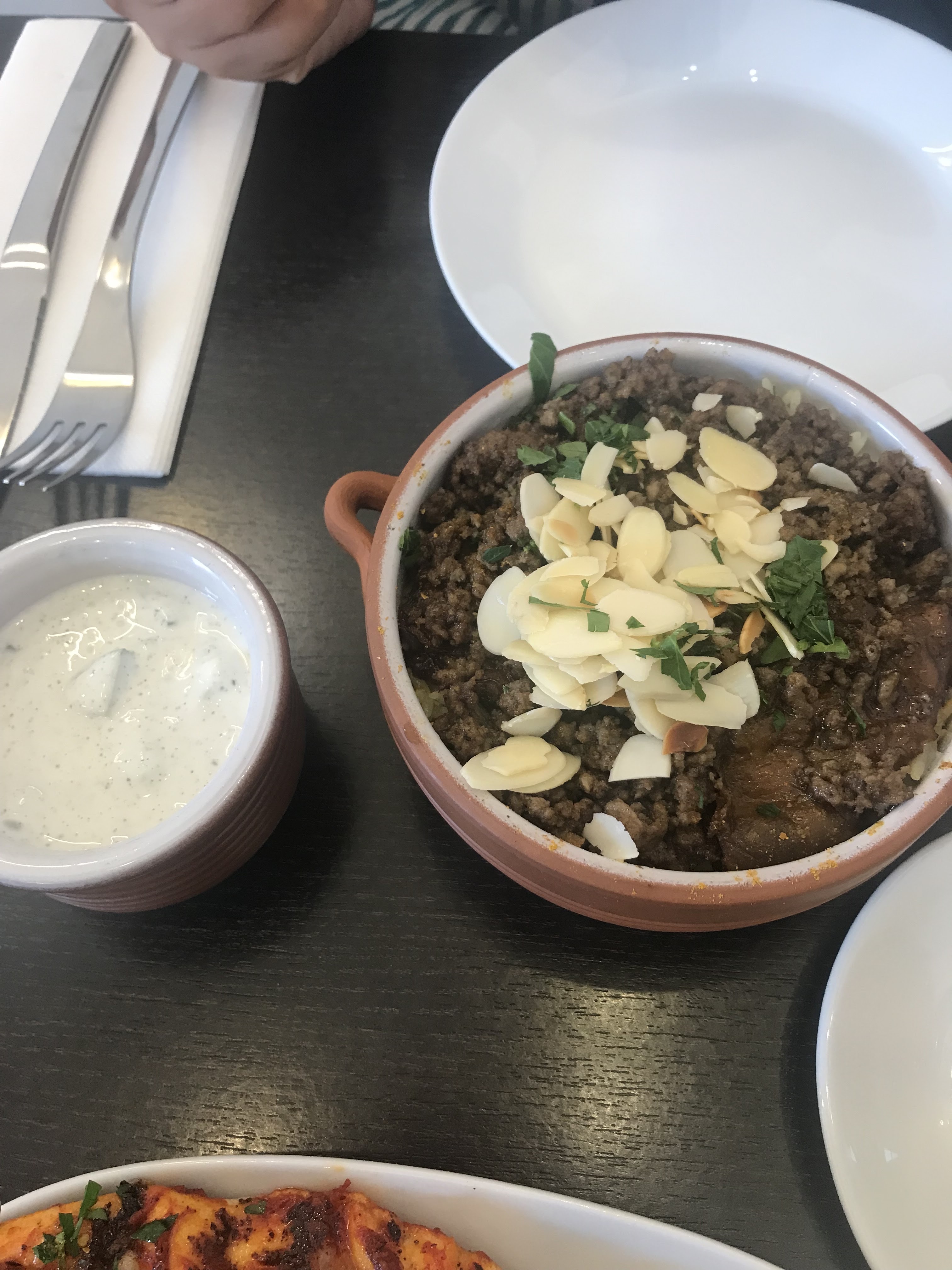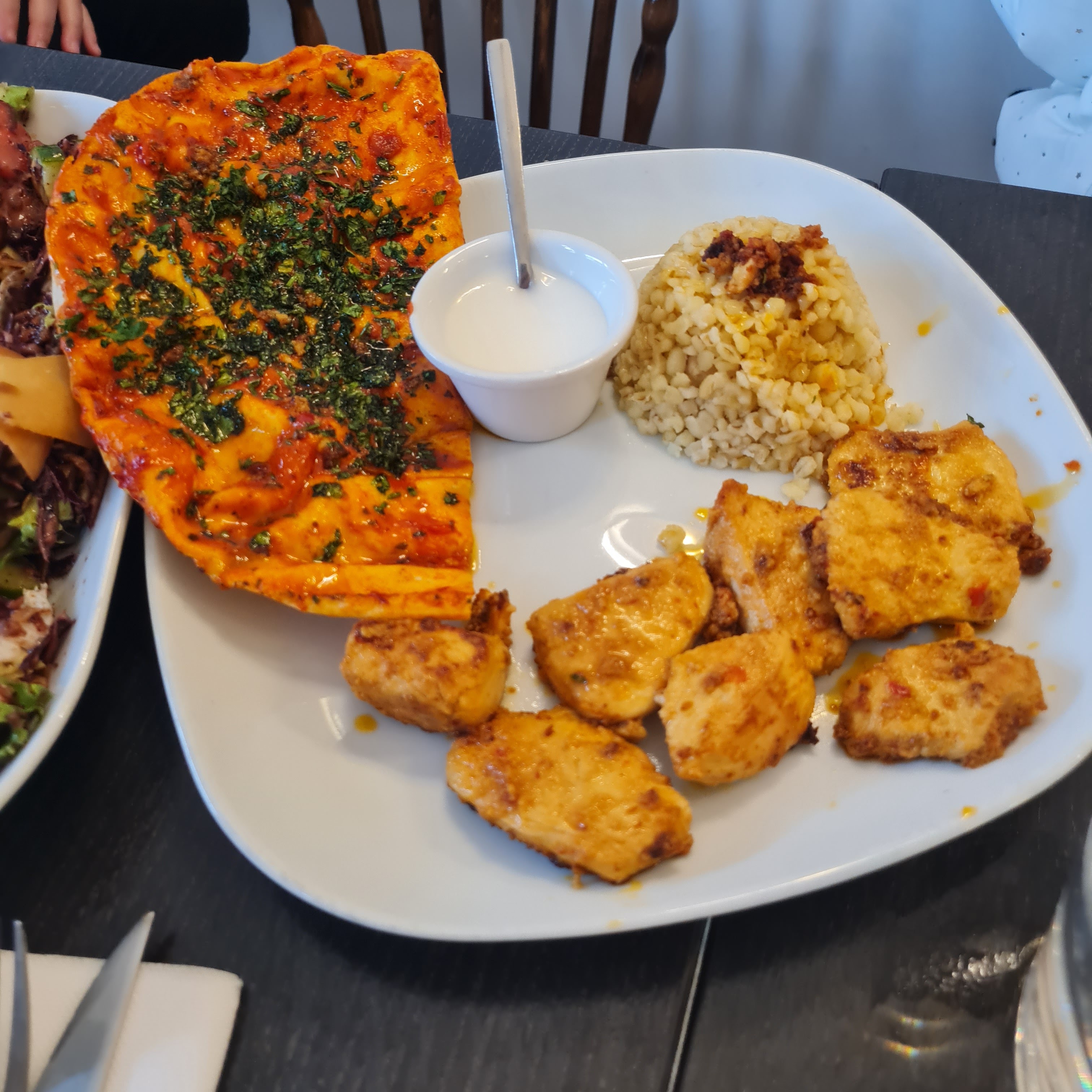 Expérience à la fois plaisante et moins ... Début de repas satisfaisant avec un delicieux houmous, la suite dans le même ton pour moi avec l'assiette de mezze que j'ai beaucoup apprécié. Déception en revanche pour mon mari qui avait choisi le plat annoncé avec de la viande d'agneau mais qui s'est avéré un petit bol composé à 95% de blé. Les 5% restant sont composés d'amandes effilées et de très rares miettes d'agneau !! Résultat sec et pauvre en saveurs. Un petit peu mesquin... Côté dessert la glace est très bonne et parfumée. Dommage, sur les photos les plats paraissaient plus généreux 🤷🏻♀️
