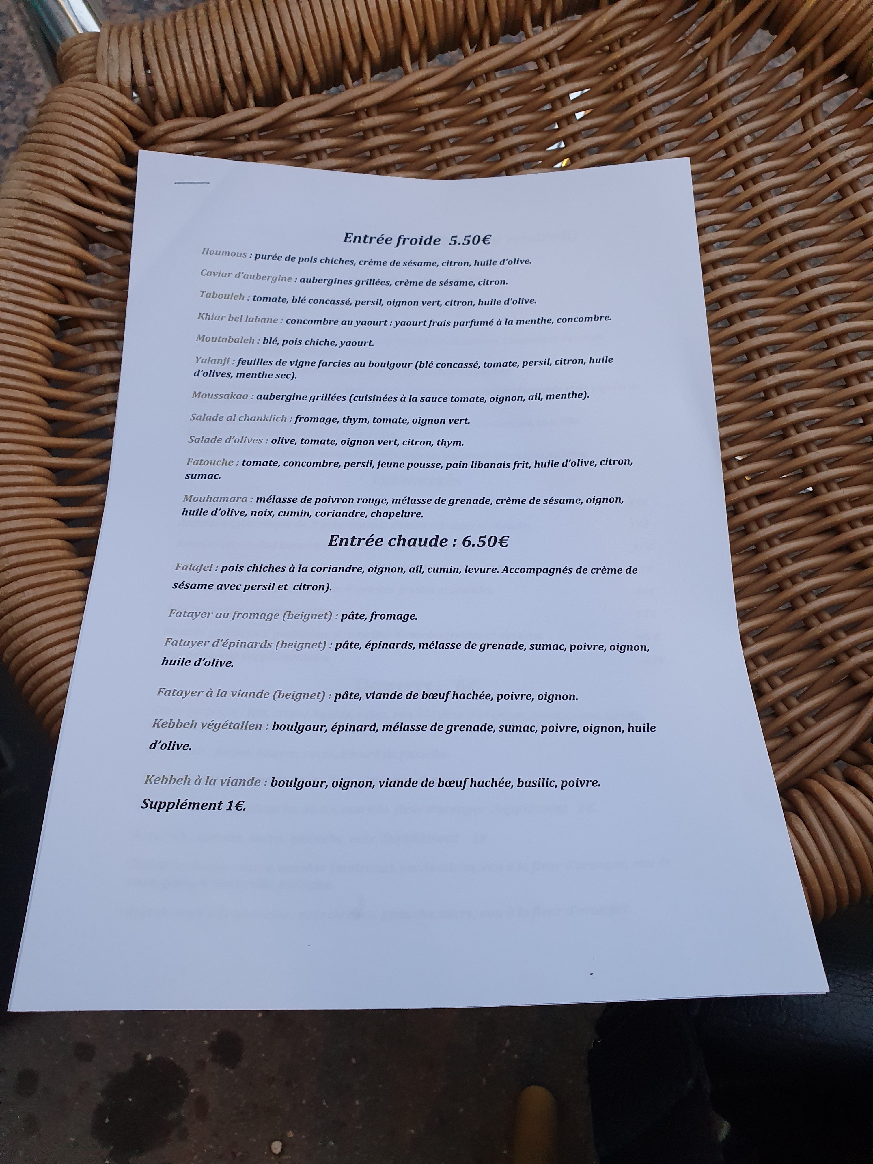 Encore une fois de passage à Rouen, nous sommes allés dans ce petit resto syrien tenu par 2 soeurs. Un régal pour les papilles. Des épices utilisées subtilement et des formules qui vous permettent de goûter plusieurs saveurs. Vaut le détour assurément