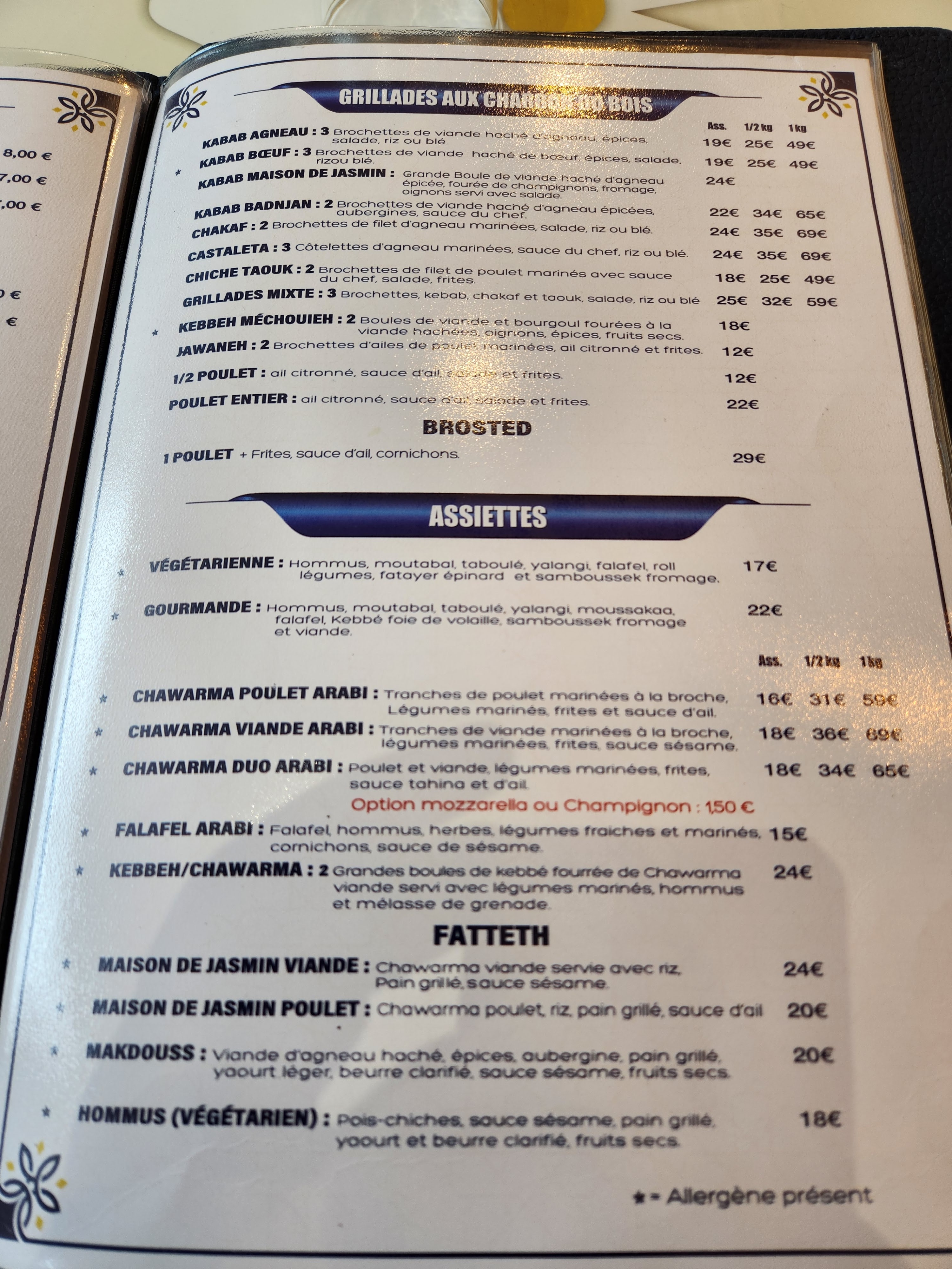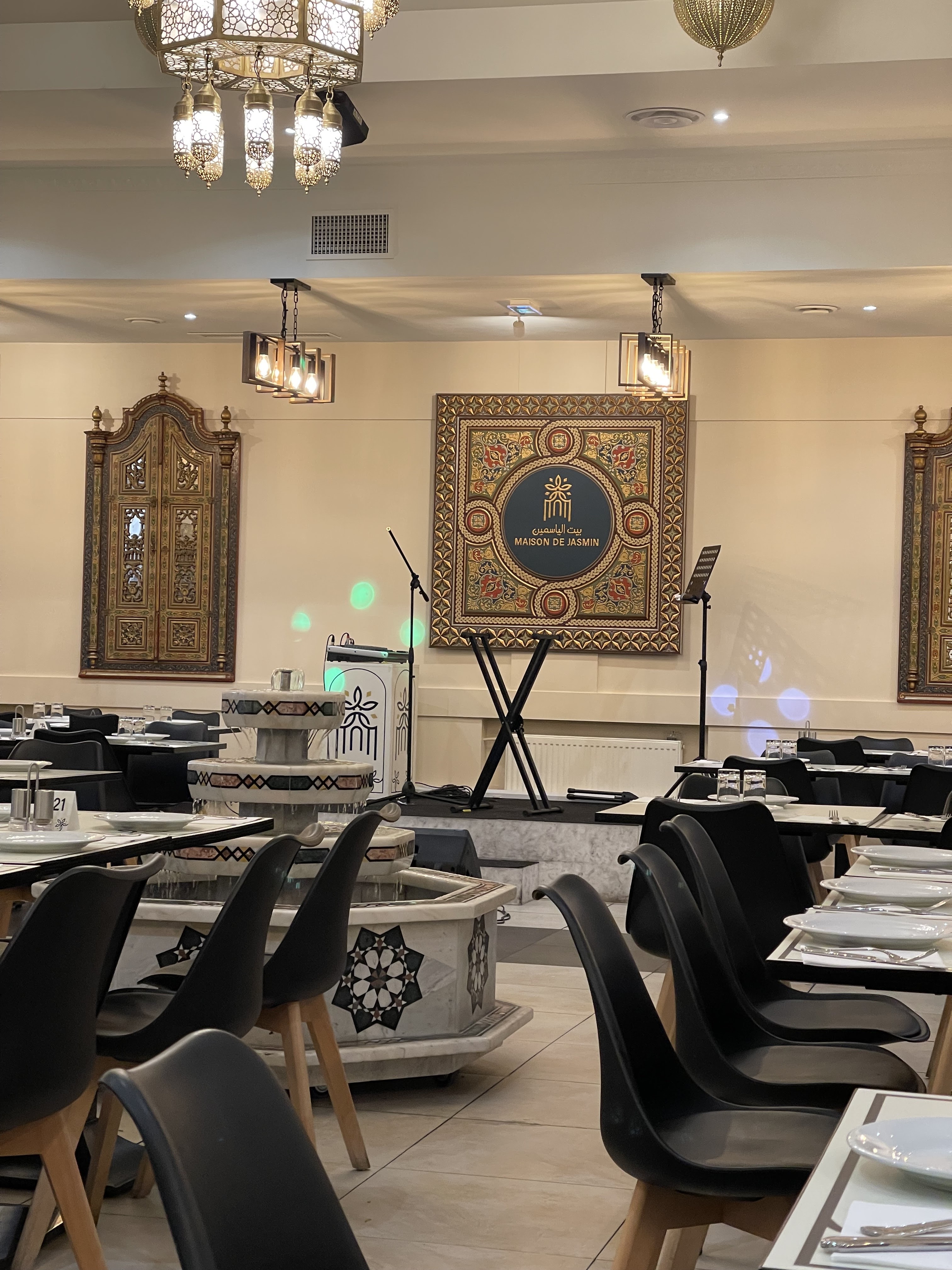 Grand et beau restaurant Il vous transporte aux maisons anciennes de Damas avec jolie fontaine et cascade, le son de l’eau vous amène très loin et vous procure sérénité et calme. Partout des chose à découvrir tradition et main d’œuvre qualifiée pour faire des pièces uniques et raffinées. Le jasmin de damas est présent par tous que vous arriverez à sentir le parfum. Que vous dire du goût, le entrée pure merveille culinaire, le chawarma est unique à paris, le méchoui, un régal de pure tradition d’Alep. Les fatayers, manakichs, pâtisseries, ambiance, services Tout est là pour rendre votre repas inoubliable. Vous méritez les 5 jasmins