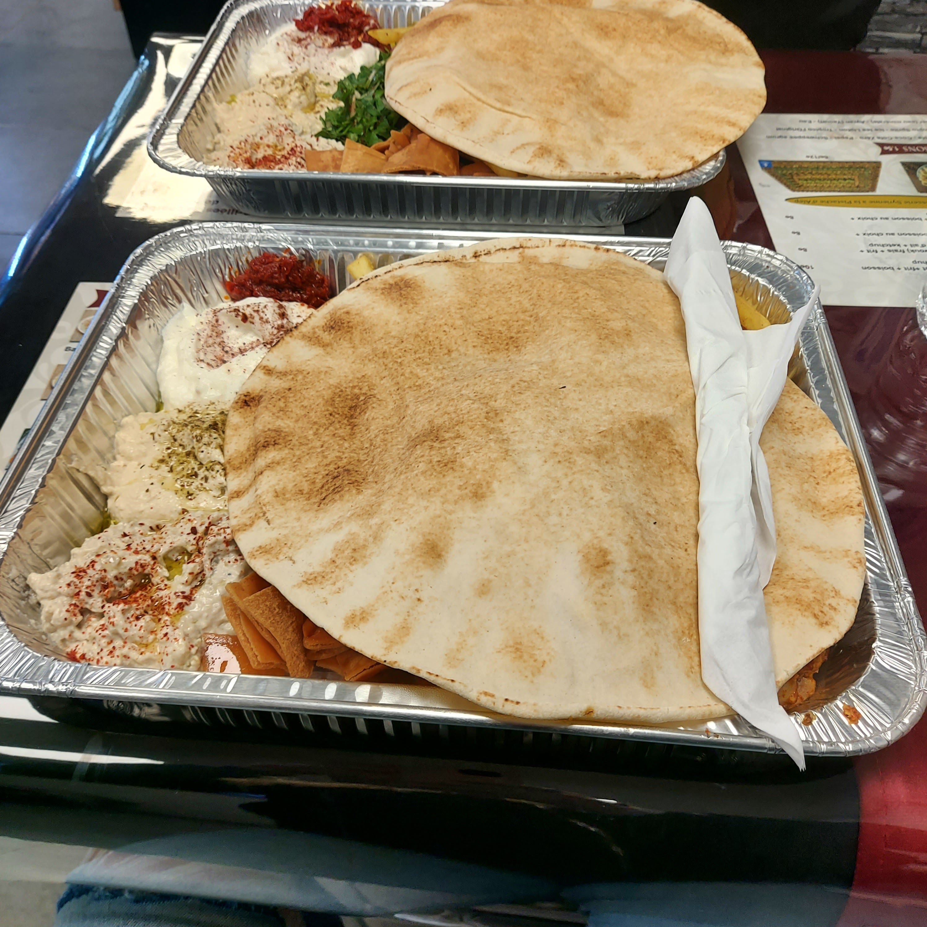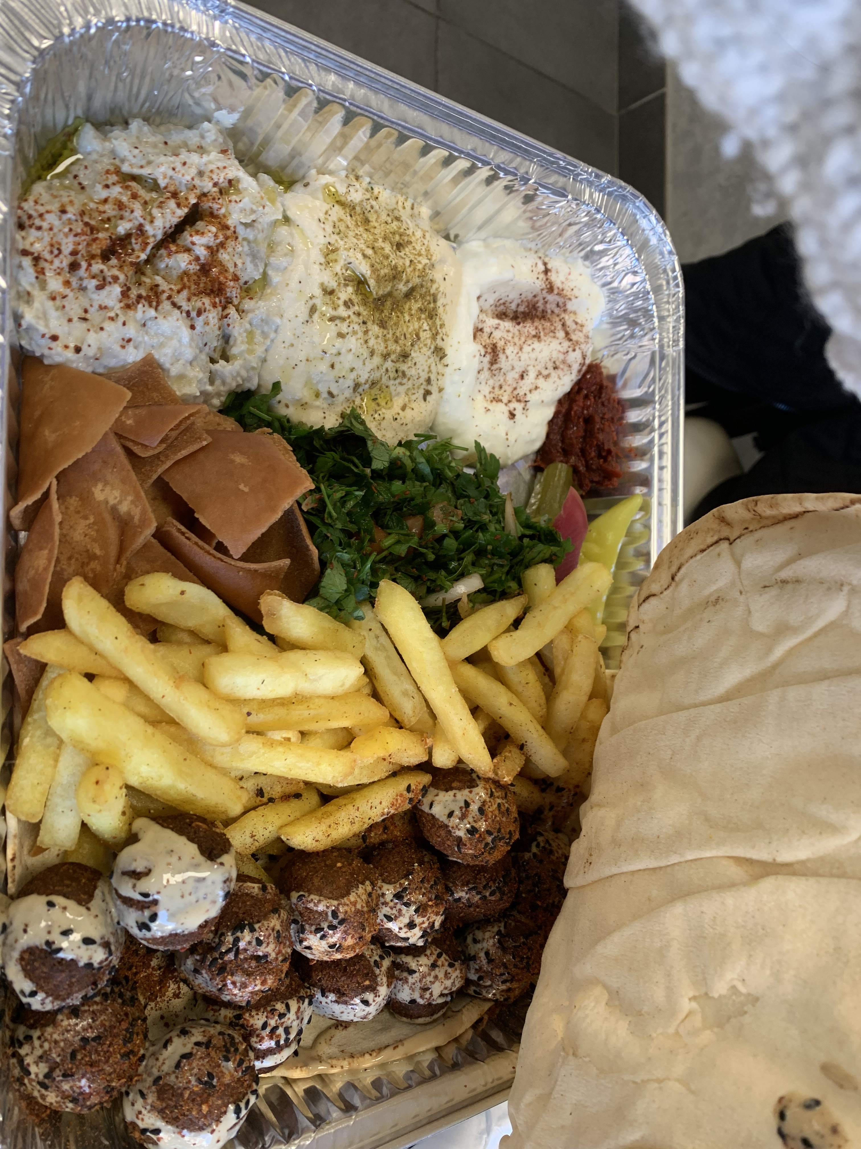 Proportions très généreuses et beaucoup de diversité. Dommage, les falafels n’ont absolument pas le goût de falafels. Je ne sais pas avec quels ingrédients elles sont faites. Idem le houmous est fade. Par contre gros plus pour la sauce à l’ail qui est délicieuse