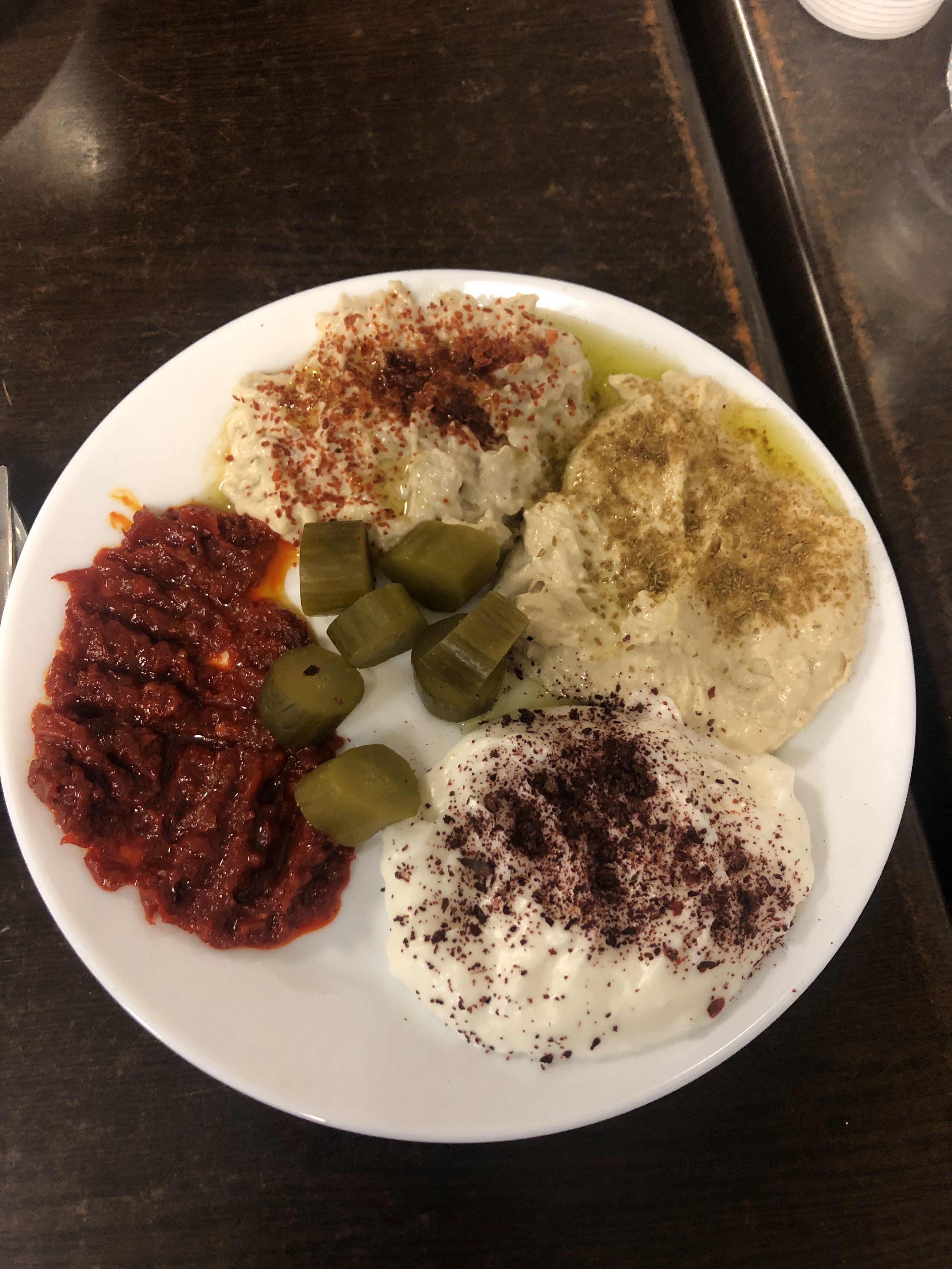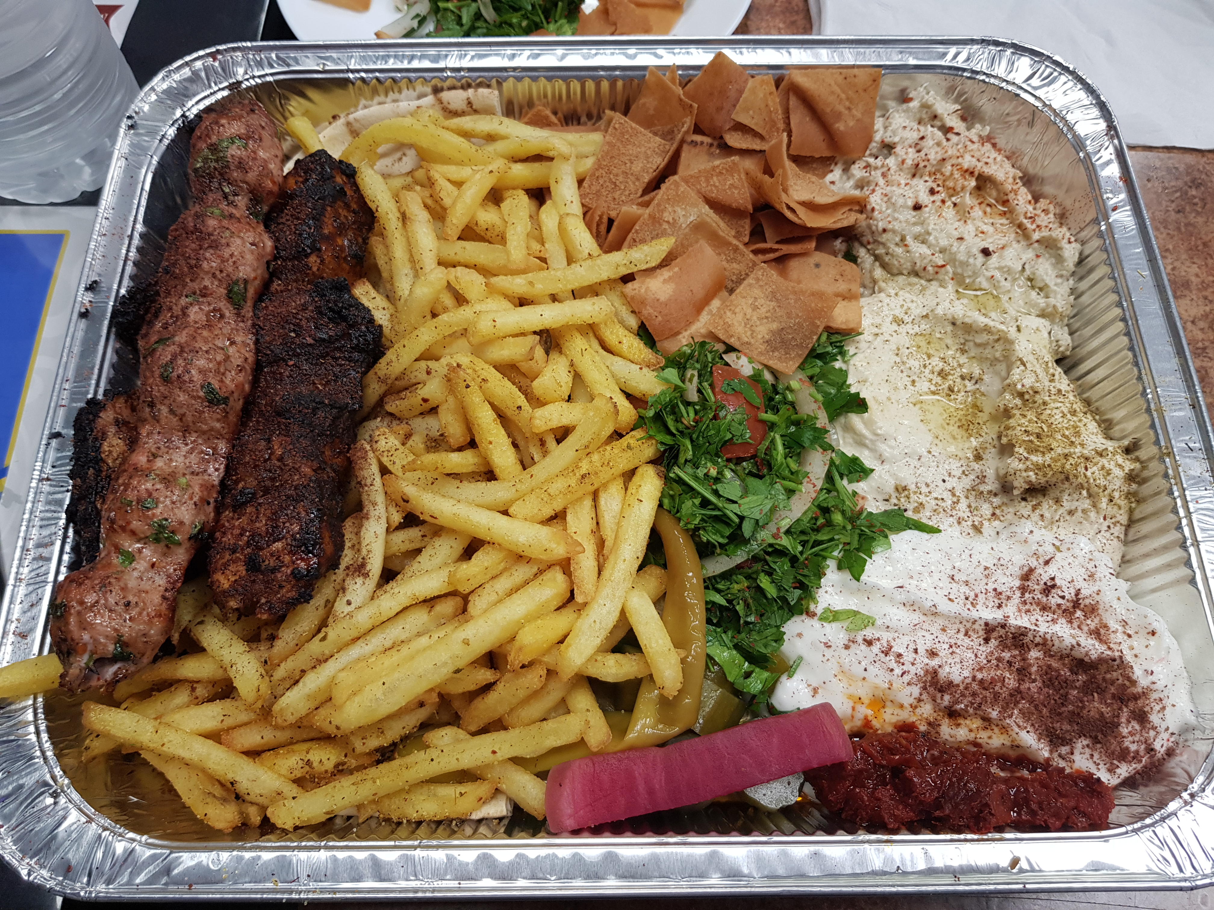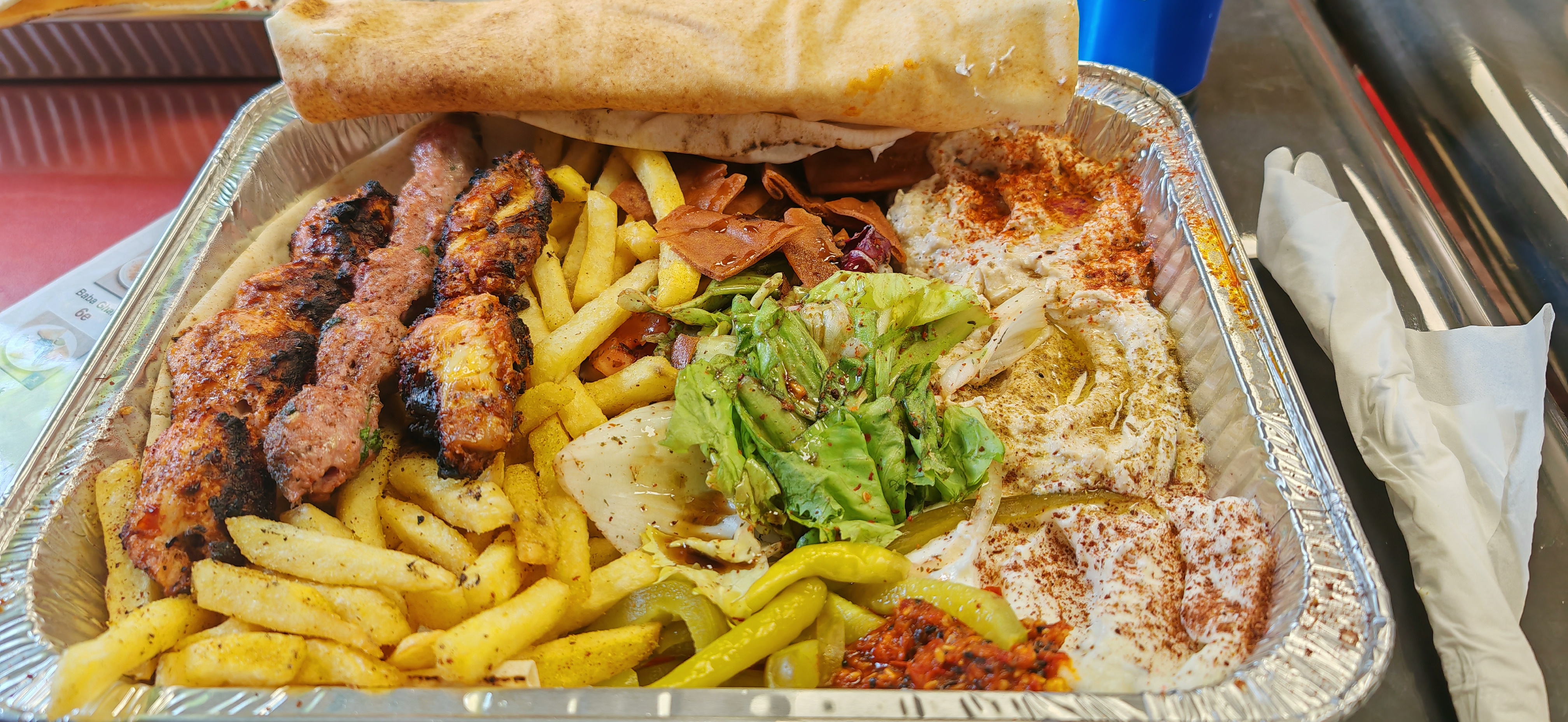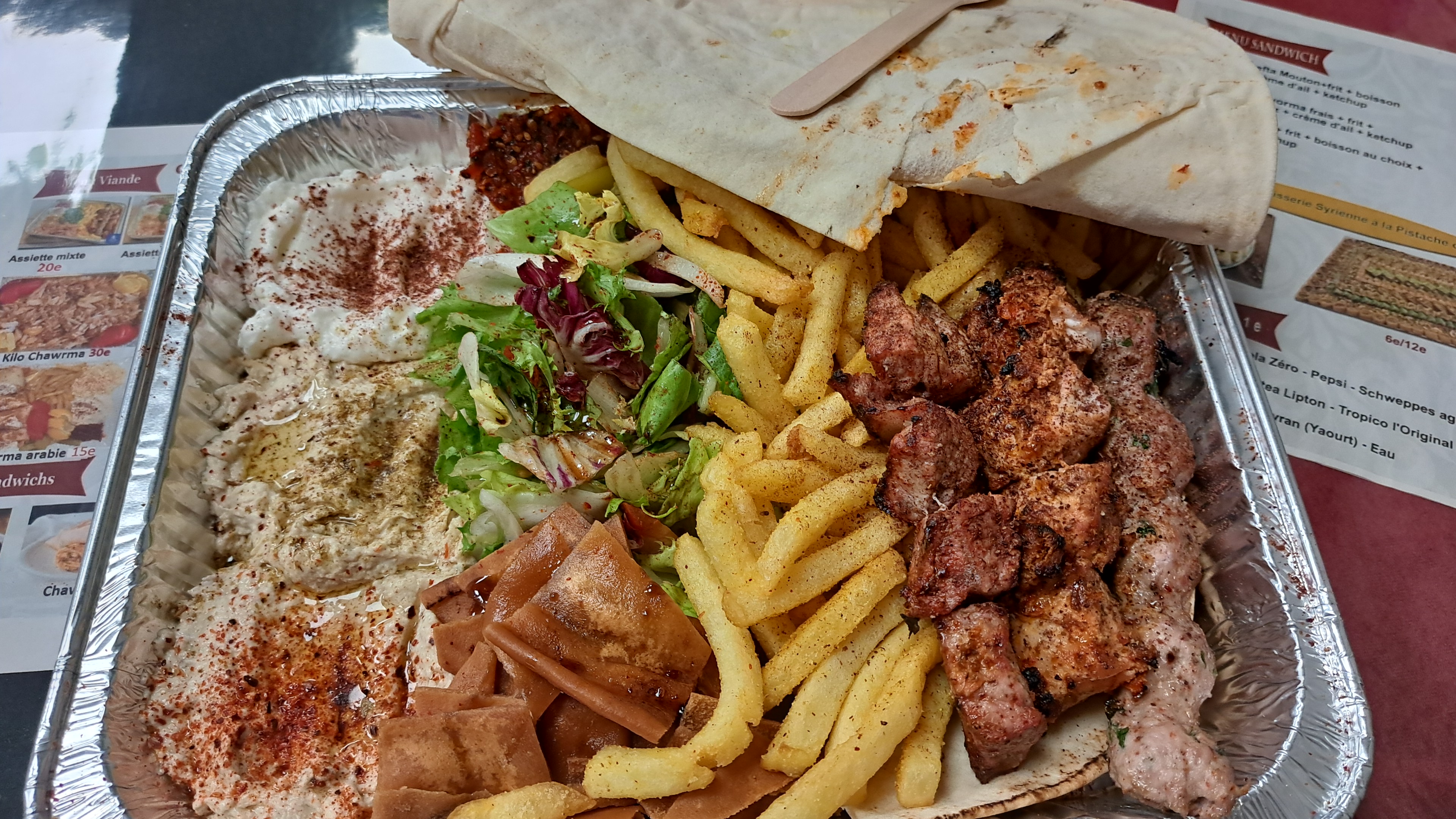 Nous avons prit une assiette mixte la viande est bonne c’était accompagné de frite de houmous , de yaourt à l’ail et de quelque herbe avec un pain libanais Le pain n’était pas chaud dommage