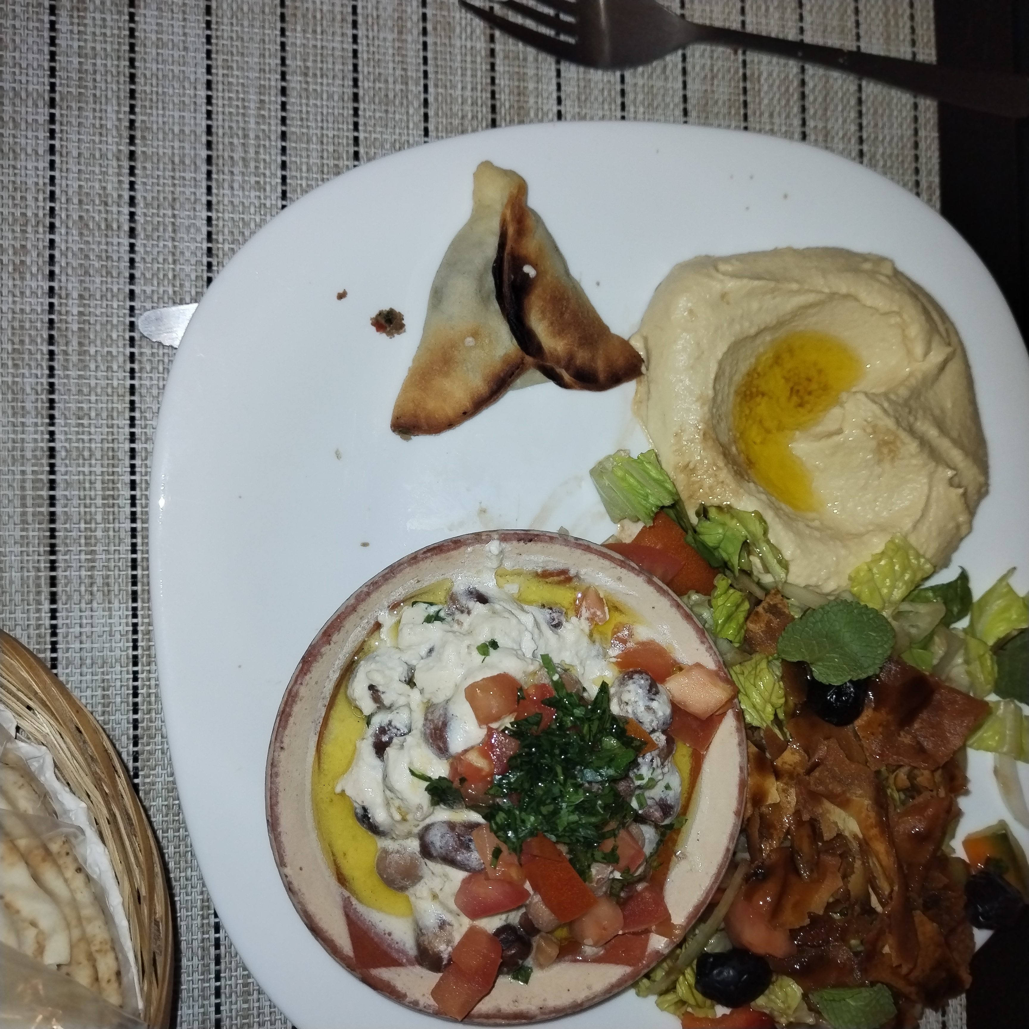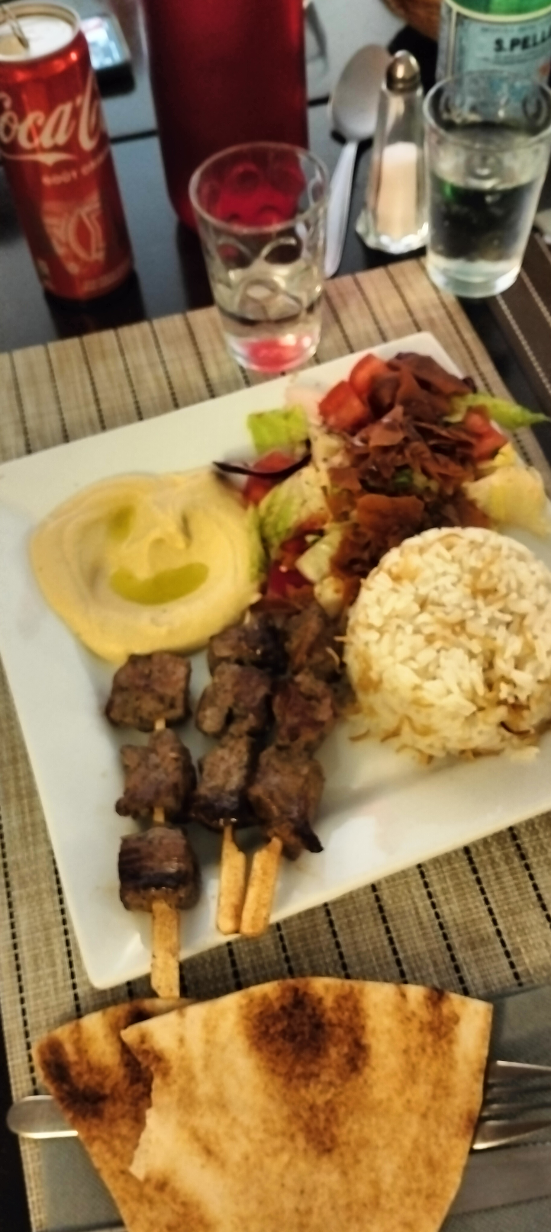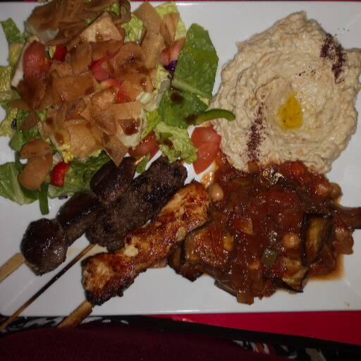 Personne dans le restaurant à part mon mari et moi. Bien que l assiette servie paraissait sympathique le goût n était pas au rendez vous. La salade de chou était immangeable et le reste fade à part les brochettes qui étaient correctes. Le dessert (baklava) était mou et devait dater de plusieurs jours. Je ne recommande pas
