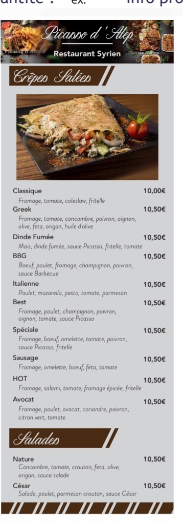 Du choix avec de très bon plats comme le chawarma ou le kefta très bien servi il faut laisser une place pour une crepe sucré qui sont excellentes et les prix sont vraiment raisonnable vu la quantité et la qualité je recommande vivement.