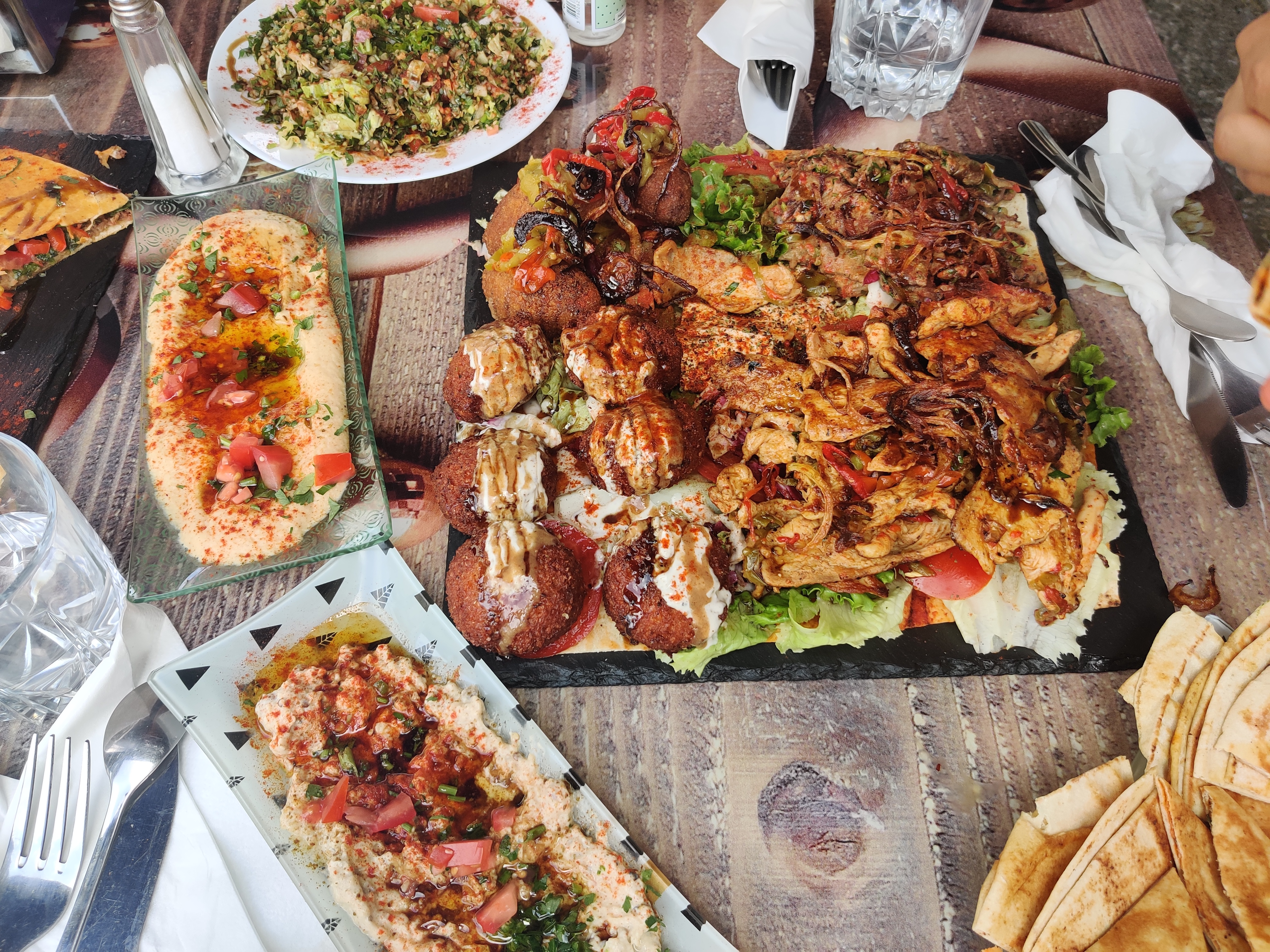 Nous avons commandé le menu syrien pour 2 personnes, vraiment fantastique, préparé avec amour. Vous goûtez à l’ambiance et aux épices du Moyen-Orient.