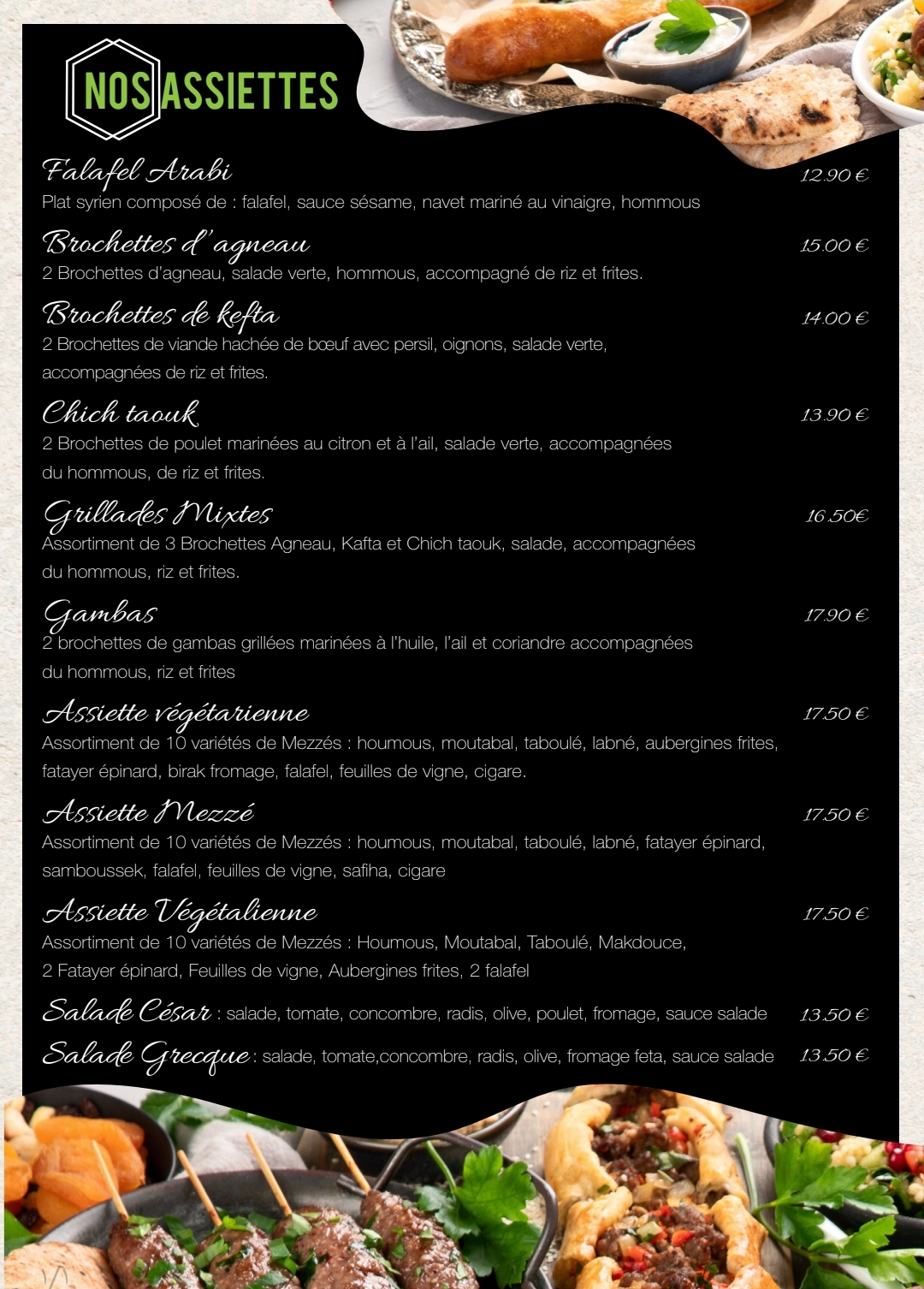 Nous avons pris des Mezzes, on a été très satisfait. C'est Très variés et Le service est super. Le restaurant offre également une grande variété de pâtisserie orientale. C'est beau et goûteux. A recommander.